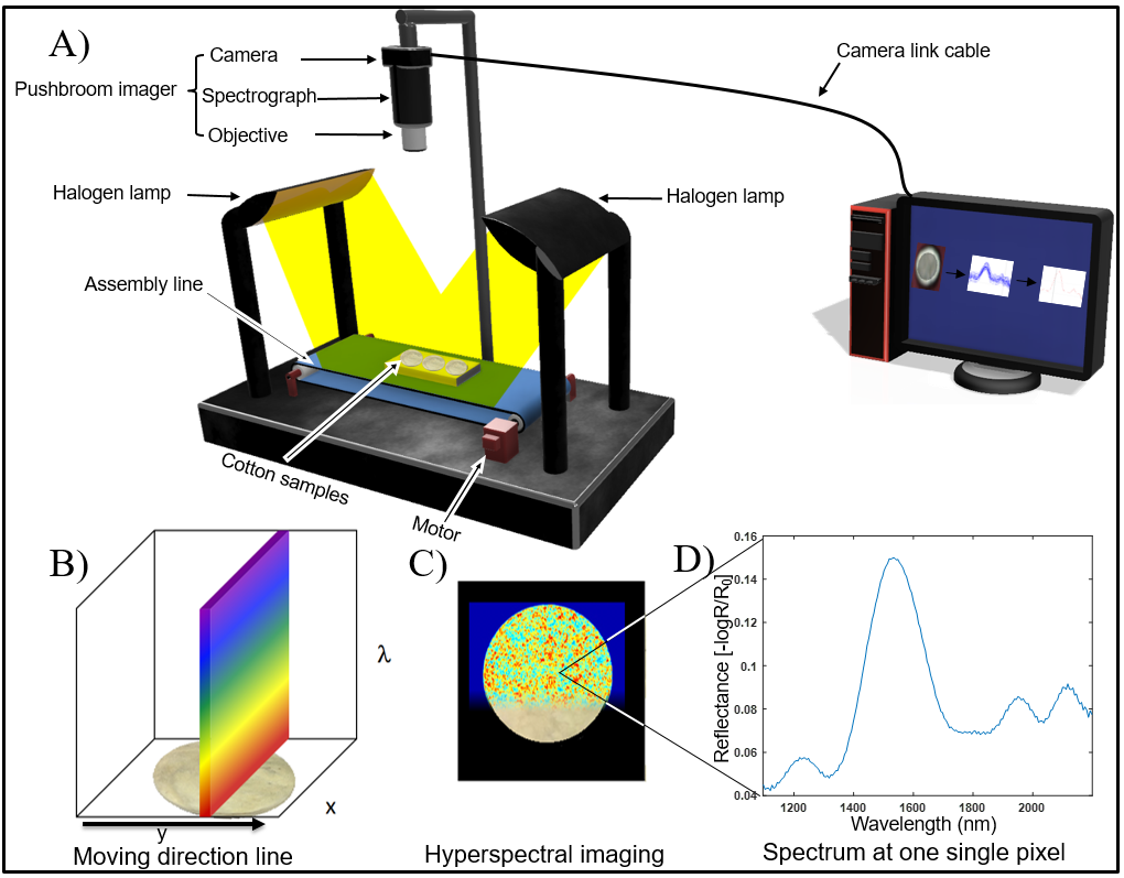Whereas, for NIR-HSI, due to the large amount of data acquired, two methodologies for data processing were applied in low and high lateral resolution. In the first method, the average of the spectra from one sample was calculated and in the second method the spectra of each pixel were used. Both methods are able to explain ≥90 % of total variance by the first two PCs. The results show that it is possible to distinguish between different cotton types based on a few selected wavelength ranges. The combination of HSI and multivariate data analysis has a strong potential in industrial applications due to its short acquisition time and low-cost development. This study opens a novel possibility for a further development of this technique towards real large-scale processes.