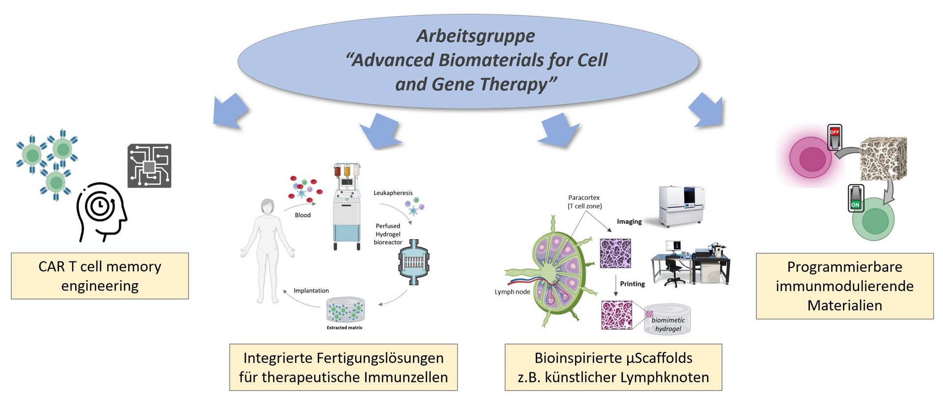 Der Forschungsschwerpunkt liegt auf Technologien und Verfahren zur Herstellung und Verabreichung von Zell- und Gentherapeutika, insbesondere unter Einsatz von neuartigen Biomaterialien, sowie der Optimierung von Zellulären Immuntherapeutika wie den Chimären Antigen Rezeptor modifizierten T Zellen (CAR T Zellen) zur Behandlung von Krebs.