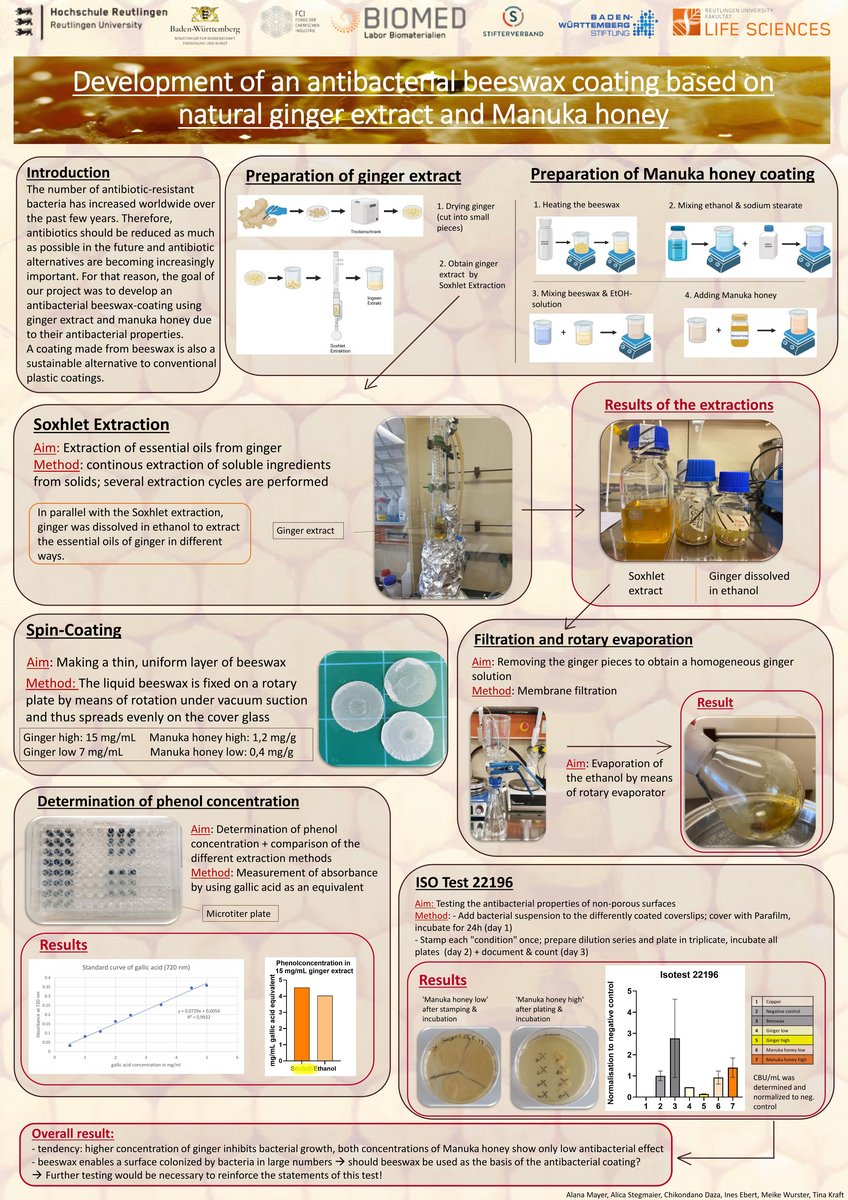 Antibakterielle Beschichtungen haben ein breites Anwendungsspektrum, das von Haushaltsgegenständen bis hin zu Krankenhauseinrichtungen reicht. Die meisten dieser Beschichtungen werden aus nicht wiederverwertbaren und nicht natürlichen Materialien hergestellt. Antibakterielle Beschichtungen natürlichen Ursprungs wären jedoch eine nachhaltige und sinnvolle Alternative. Darüber hinaus könnten die natürlichen Extrakte als Antibiotika-Alternative verwendet werden, um zu verhindern, dass Bakterien eine weitere Resistenz gegen bestehende Antibiotika entwickeln. Das Ziel war es, eine antibakterielle Beschichtung zu entwickeln, die Bienenwachs als natürliche Grundlage verwendet. Die antibakteriellen Komponenten wären in unserem Fall Ingwerextrakt und Manuka-Honig, ein spezieller Honig mit einer natürlichen antibakteriellen Verbindung namens MGO. Wir haben verschiedene Konzentrationen jedes Extrakts hergestellt und die Beschichtung mit Hilfe eines ISO 22196-Tests auf ihre antibakteriellen Eigenschaften geprüft. Die Ergebnisse werden auf dem unten stehenden Poster vorgestellt oder sind im zugehörigen YouTube-Video zu sehen.