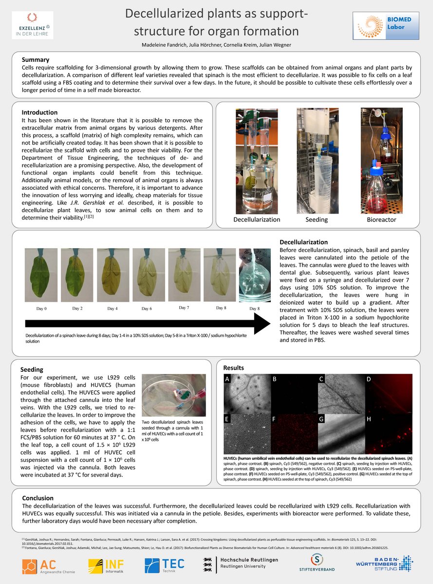 Organversagen ist eine der größten medizinischen Herausforderungen in unserer Gesellschaft. Aufgrund des Mangels an Organ- und Gewebespendern gewinnen Methoden wie Tissue Engineering zunehmend an Bedeutung. Eine Abstoßungsreaktion kann eine lebensbedrohliche Nebenwirkung von Transplantaten sein. Um dies zu vermeiden, wird veruscht die körpereigenen Zellen in eine Matrix oder ein Gerüst zu transplantieren, um künstliche Organe zu generieren. Gerüste tierischen oder menschlichen Ursprungs sind jedoch sehr teuer und bergen ethische Risiken. Daher wurden in diesem Projekt dezellularisierte Pflanzenblätter als potentiell geeignetes Gerüst für die Rezellularisierung mit verschiedenen Zelltypen untersucht. Die Ergebnisse werden auf dem untenstehenden Poster vorgestellt oder können im zugehörigen YouTube-Video angesehen werden.